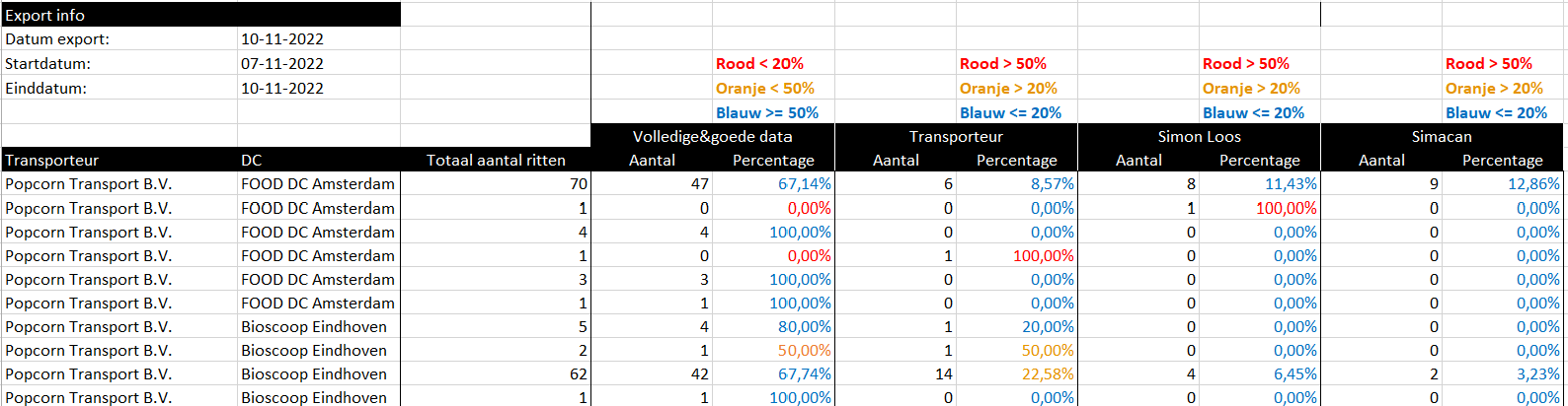 Tabblad 1 geeft een samenvatting van de data compleetheid van alle transporteurs. De andere tabbladen geven inzicht in welke ritten fout zijn gegaan. Daarbij is het mogelijk om te klikken op een ritnummer, waardoor je als gebruiker naar de rit in de Control Tower wordt gestuurd.