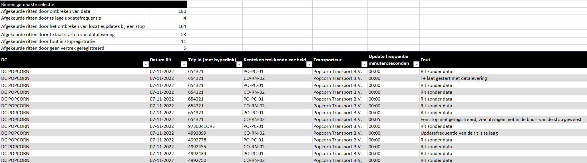 - Deze bladen bevatten de redenen waarom de ritten als incorrect zijn geklasseerd. Als er meerdere redenen zijn, wordt alleen de belangrijkste reden getoond. De kolom "trip id" is tevens een hyperlink naar de trip in de Control Tower.