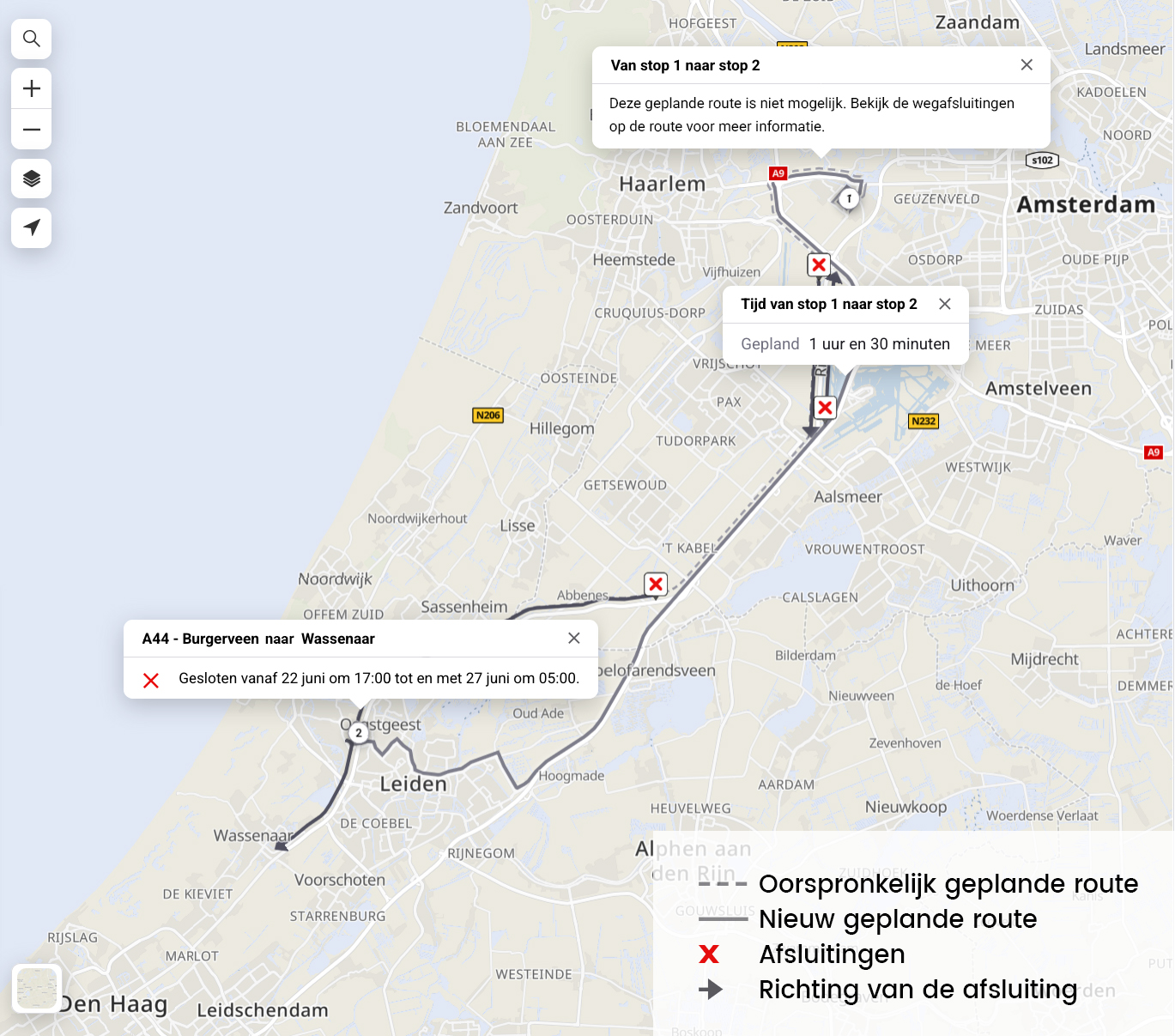 Dit omvat ook geplande en bevestigde afsluitingen die (nog) niet zijn opgenomen in openbare databases. Het platform past (geplande) routes hier vervolgens automatisch op aan. Zo beschik je altijd over de meest actuele en optimale route, zonder handmatig ingrijpen.