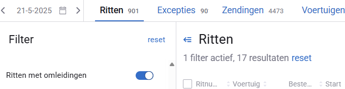Zet de toggle (schuifknop) voor het filter ‘Ritten met omleidingen’ aan in de filterkolom aan de linkerkant.